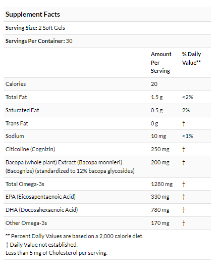 Mental Focus Cognitive Support Neurological Health 1280 mg Omega-3 With Citicoline & Bacopa Monnieri Extract Superior Triglyceride Form Non GMO Verified Third-Party Purity Tested Dietary Supplement Molecularly Distilled | Guaranteed Purity Wild Caught Pure No Fishy Aftertaste Friend of the Sea Certified Sustainable Omega Focus is a unique blend of nutrients that benefits attention and focus by supporting overall brain...